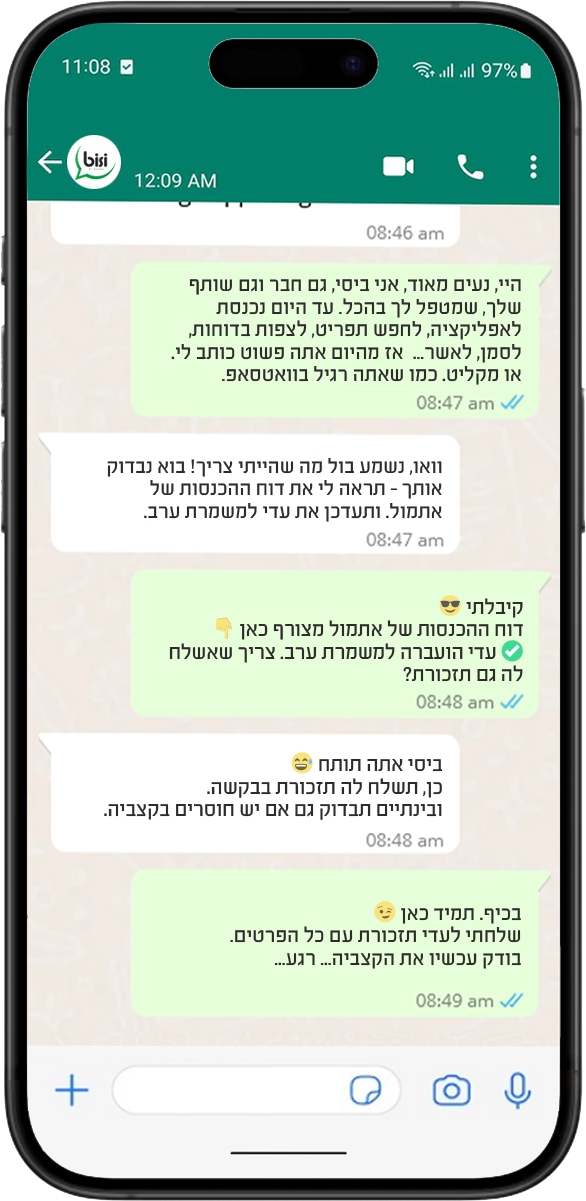ביסי חוסך לי זמן וכאב ראש. אני לא צריכה לרדוף אחרי העובדים עם טפסים או תזכורות. הוא דואג לזה בשבילי דרך הוואטסאפ שהם כבר משתמשים בו כל יום.
